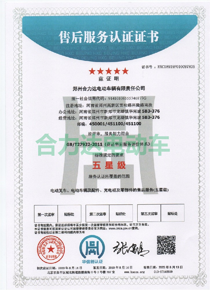 公司已通過國家相關部門頒發的多種體系認證證書,搬運車和蓄電池觀光車取得國家特種設備制造許可證,2011年公司被河南省發改委、科學技術廳、科學院、農科院共同頒發“河南省**科技型企業” 。